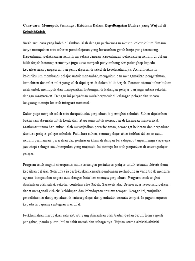 Usaha Memupuk Perpaduan Kaum from imgv2-1-f.scribdassets.com Namun begitu, apakah cara yang paling efektif untuk memupuk semangat perpaduan dalam kalangan murid? Aktiviti tersebut bukan sahaja dapat memupuk semangat patriotik malahan dapat mengeratkan perpaduan antara kaum di negara kita. Masyarakat sabah sangat dikenali sebagai masyarakat yang bertoleransi serta mementingkan aspek perpaduan dalam kehidupan seharian. Sebagai langkah pertama dalam membentuk perpaduan, rakyat haruslah bergaul dan memupuk persefahaman antara kaum. Semangat kejiranan semakin hari semakin luntur dalam kalangan masyarakat. Memupuk semangat perpaduan dan patriosme. Kepelbagaian kaum dan budaya di malaysia merupakan aspek yang penting untuk mewujudkan perpaduan. Hal ini demikian kerana perpaduan merupakan asas pembentukan sebuah negara yang progresif dan maju.