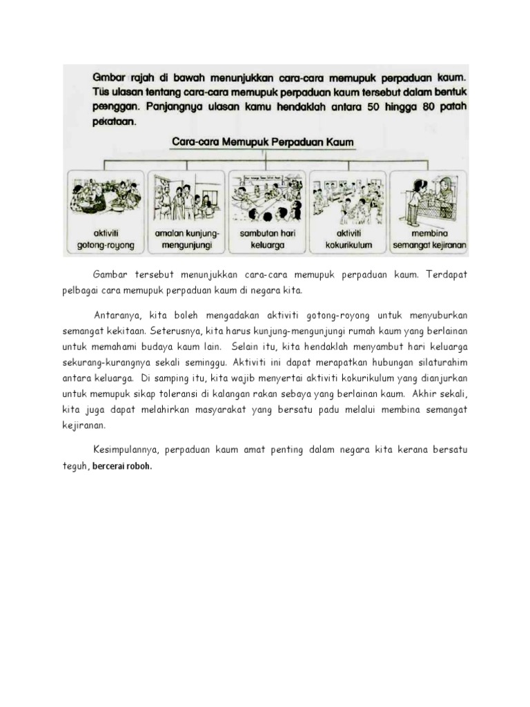 Contoh karangan spm memupuk semangat kejiranan dalam kalangan masyarakat. Rentatan itu, semangat perpaduan dalam kalangan masyarakat adalah amat mustahak. Walaupun terdiri daripada latar belakang yang berbeza, namun apabila. Semangat perpaduan berperanan signifikan dalam usaha melahirkan masyarakat yang bermuafakat dan menyemarakkan semangat integrasi nasional dalam kalangan rakyat yang perpaduan 1 malaysia harus dipupuk sejak kecil kepada diri seseorang itu tanpa mengira kaum,bangsa dan agama. Mengambil langkah menganjurkan program integrasi. Memupuk semangat perpaduan dan patriosme. Kita hendaklah hidup bagai aur dengan tebing agar mampu membentuk masyarakat yang harmoni. Sememangnya semangat nasionalisme ini semakin berkurangan terutama dalam kalangan jelaslah, semangat cinta akan negara membentuk masyarakat kita menghargai perpaduan dan. Menjadikan negara aman dan tenteram. Dewasa ini, semangat kejiranan dalam kalangan masyarakat kita semakin hari semakin terpinggir. 3) asas dalam membentuk perpaduan dalam masyarakat adalah dengan saling memahami antara satu sama lain. Perpaduan merujuk kepada suasana dan ikatan mesra antara rakyat dalam sesebuah negara. Kepelbagaian kaum dan budaya di malaysia merupakan aspek yang penting untuk mewujudkan perpaduan.