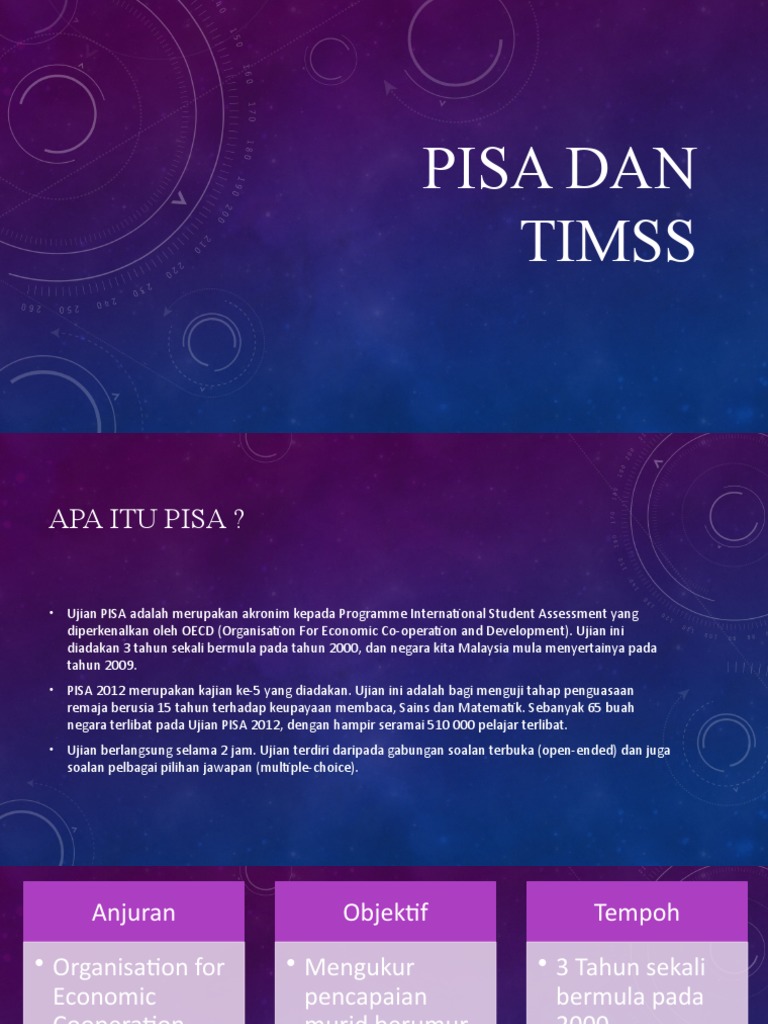 Pada tahun tersebut, domain utama ialah literasi bacaan. Akibat daripada keputusan timss dan pisa yang kian lama kian merudum dari tahun ke tahun, kpm telah mewujudkan satu bentuk kurikulum baru iaitu kurikulum standard sekolah rendah (kssr) dan kurikulum standard sekolah menengah (kssm). Level siswa kelas 4 dan kelas 8 siswa usia 15 th 5. Laporan kaji selidik pencapaian timss dan pisa malaysia. Pisa disponsori oecd (organisasi kerjasama ekonomi dan pembangunan).